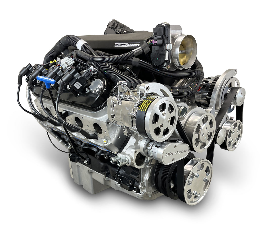 The LS-compatible layout has become a favorite for its rock-solid reliability and proven track record, this BluePrint 427 c.i. Pro Series is a street-ready powerhouse built for performance. Delivering a power packed 600 horsepower and 530 ft-lbs of torque, this popular LS-compatible engine is perfect for restomods, street machines, and pro-touring builds. At its core is a high-strength BluePrint cast iron block with LSX-style features��thicker decks, reinforced webbing, and extended cylinder skirts for added durability. It's topped with LS3-style aluminum heads, a 11:1 compression ratio, hydraulic roller cam, forged pistons, and a forged crankshaft. The deluxe dressed package includes a polished serpentine front drive kit, BluePrint Engines Fabbed Aluminum Intake Manifold, BluePrint Engines Calibrated ECU and harness, drive-by-wire throttle pedal, sensors, and throttle body��delivering plug-and-play performance right out of the box.