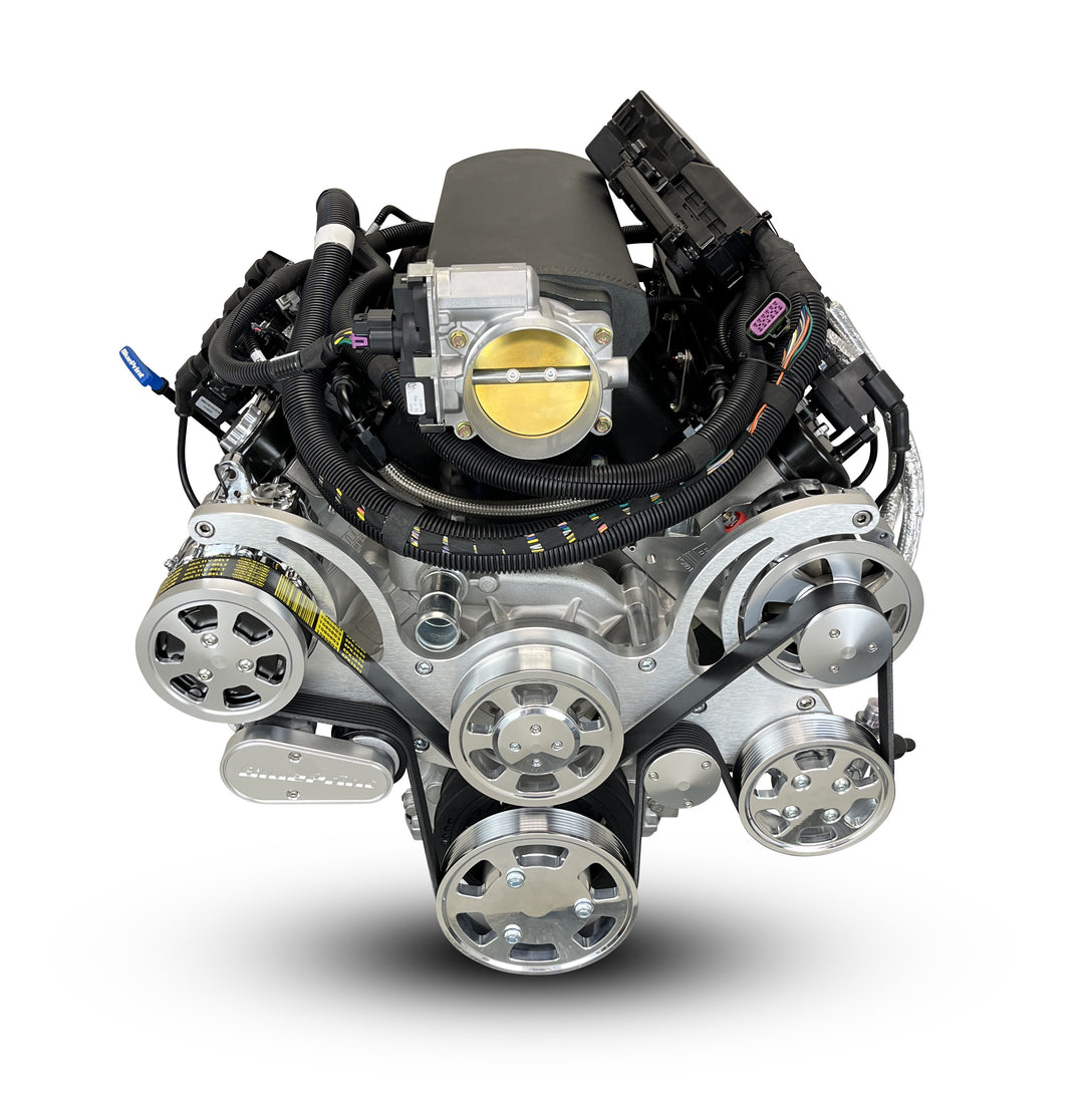 The LS-compatible layout has become a favorite for its rock-solid reliability and proven track record, this BluePrint 376 c.i. Pro Series is a street-ready powerhouse built for performance. Delivering a power packed 525 horsepower and 460 ft-lbs of torque, this popular LS-compatible engine is perfect for restomods, street machines, and pro-touring builds. At its core is a high-strength BluePrint cast iron block with LSX-style features��thicker decks, reinforced webbing, and extended cylinder skirts for added durability. It's topped with LS3-style aluminum heads, a 10.7:1 compression ratio, hydraulic roller cam, hypereutectic pistons, and a nodular iron crankshaft. The deluxe dressed package includes a polished serpentine front drive kit, BluePrint Engines Fabbed Aluminum Intake Manifold, BluePrint Engines Calibrated ECU and harness, drive-by-wire throttle pedal, sensors, and throttle body��delivering plug-and-play performance right out of the box.