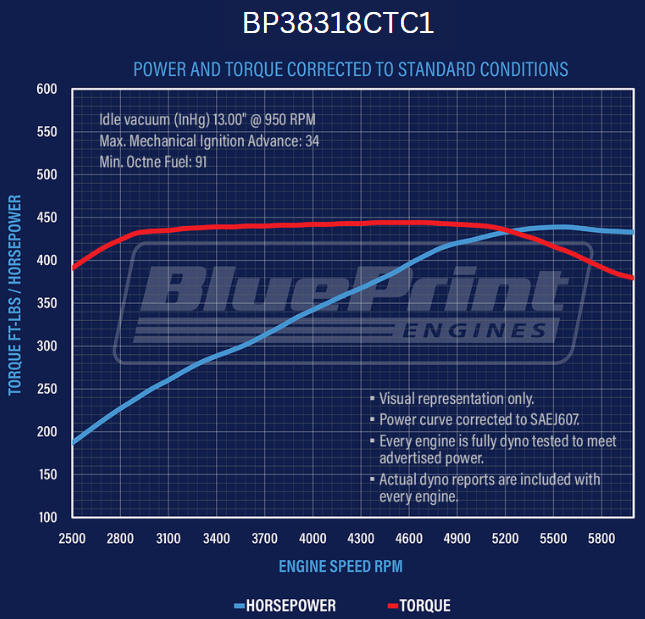 BluePrint's BP38318CTC1 GM Small Block compatible performance crate engines is dyno tested to get 436 horsepower and 443 minimum torque values. This engine features a 4-inch bore which mathematically yields a 377ci with a 3.75-inch stroke. This engine comes with a Timing Cover, Valve Covers, Distributor, Dipstick, Oil Pan, Dual Plane Satin Aluminum Intake and Holley 750cfm Carburetor with Manual Choke.�