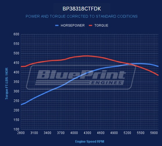 BluePrint's BP38318CTFDK GM Small Block compatible performance crate engines are dyno tested at our factory with a Holley Sniper 2 EFI System to get 436 horsepower and 443 minimum torque values. This engine features a 4-inch bore which mathematically yields a 377ci with a 3.75-inch stroke. This engine comes with a timing cover, valve covers, distributor, dipstick, oil pan, air cleaner, spark plug / wires, and dual plane satin aluminum intake, Holley Sniper 2 EFI system, and black pulley Kit.