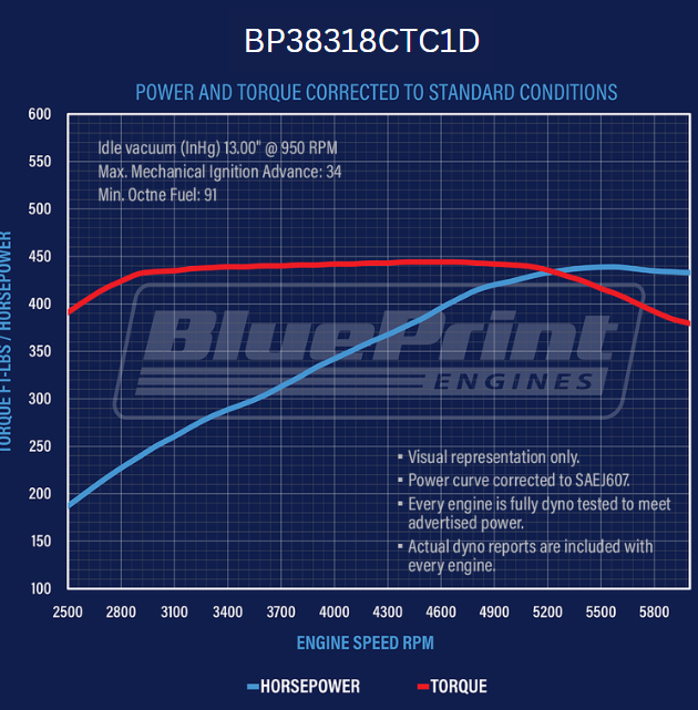 BluePrint's BP38318CTC1D GM Small Block compatible performance crate engines are Dyno tested at our factory with a Holley Classic 750cfm Carburetor to get 436 horsepower and 443 minimum torque values. This engine features a 4-inch bore which mathematically yields a 377ci with a 3.75-inch stroke. This engine comes with a Timing Cover, Valve Covers, Distributor, Dipstick, Oil Pan, Spark Plugs and Wires, Dual Plane Satin Aluminum Intake, Holley 750cfm Carburetor with Manual Choke, and Air Cleaner.