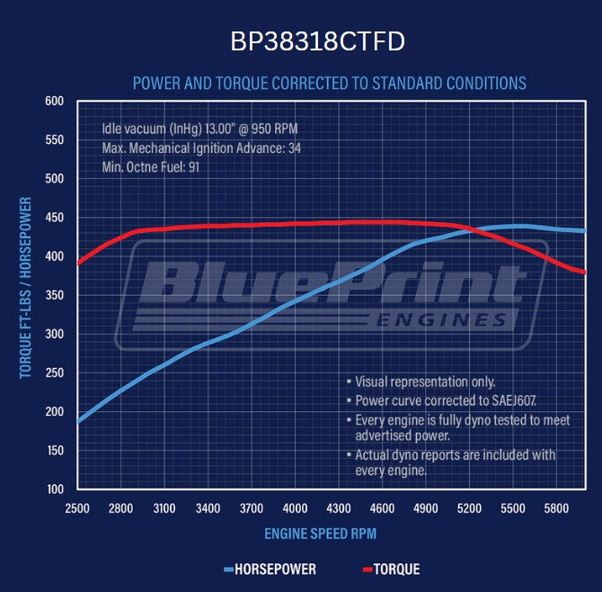 BluePrint's BP38318CTFD GM Small Block compatible performance crate engines are Dyno tested at our factory with a Holley Sniper 2 EFI System to get 436 horsepower and 443 minimum torque values. This engine features a 4-inch bore which mathematically yields a 377ci with a 3.75-inch stroke. This engine comes with a Timing Cover, Valve Covers, Distributor, Dipstick, Oil Pan, Air Cleaner, Spark Plug / Wires, and Dual Plane Satin Aluminum Intake and Holley Sniper 2 EFI System.