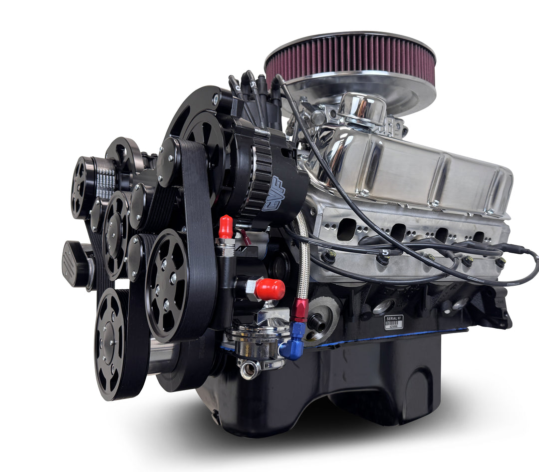 GM Small Block Compatible 383 c.i. Low Profile Engine - 436 Horsepower - Deluxe Dressed - Polished Pulley Kit - Carbureted